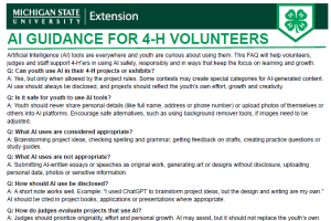Artificial Intelligence (AI) tools are everywhere and youth are curious about using them. This FAQ will help volunteers, judges and staff support 4-H’ers in using AI safely, responsibly and in ways that keep the focus on learning and growth. -