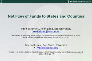 As part of the More Resilient Michigan event hosted by the MSU Extension Center for Local Government Finance and Policy, this presentation explores the net flow of federal funds to states and counties. -