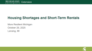 As part of the More Resilient Michigan event hosted by the MSU Extension Center for Local Government Finance and Policy, this presentation shares key information related to housing and short-term rentals in Michigan. -