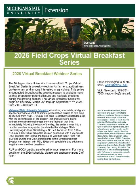 The Michigan State University Extension Field Crops Virtual Breakfast Series is a weekly webinar for farmers, agribusiness professionals, and anyone interested in agriculture. This series is conducted throughout the growing season to assist farmers as they prepare for potential issues and navigate problems during the growing season. The Virtual Breakfast Series will begin on Thursday, March 26ththrough September 17th, 2026from 7:00 –8:00 am ET.