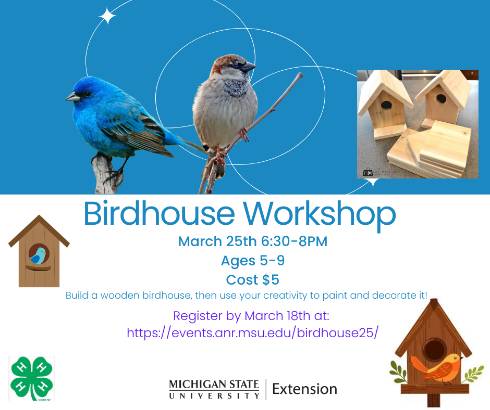 Youth ages 5-9 will build a wooden birdhouse, then use their creativity to paint and decorate it. Adult helpers are needed for ages 5-7.