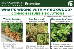 This diagnostic guide highlights six common problems that affect boxwood shrubs in Michigan. Each common issue is illustrated with photos, key identifying features, and management recommendations. -