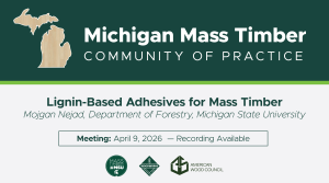 In this meeting, we welcomed Dr. Mojgan Nejad, MSU Department of Forestry, who presented about her lab’s innovation in lignin-based adhesives and pathways to commercializing these biodegradable, lower-carbon options in mass timber products. -