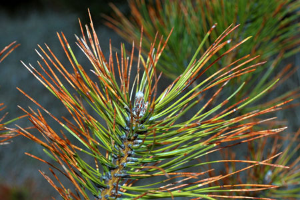 Winter injury during tree dormancy can also occur from low humidity, sunny conditions and high winds that desiccate needle, bud and twig tissue causing dehydration, damage and death. Affected needles turn brown and may appear banded or mottled. Injured twigs become brittle and the growth cambium located just below the bark turns green to brown. Injured buds can appear green at first, but if cut horizontally in half they exhibit brown, dead needle primordia in the center just below the bud scales. Injured buds will fail to develop.