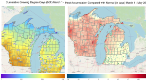 Spring is off to a fast start with growing degree day accumulations across Michigan. (Photo 2a) Compared to average, most of the state is between three to 10 days ahead in growing degree day accumulation (Photo 2b).