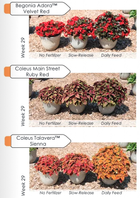 We would expect that any petunia, garden mum or heavy-feeding plant would look similar under the conditions. These plants require a little extra maintenance from the gardener to look their best. However, some plants looked a lot better than others with very little to no fertility provided. Begonia Adora ‘Velvet Red’, Coleus Main Street ‘Ruby Red’ and Coleus Talavera ‘Sienna’ all performed relatively well considering the low or no fertility throughout the season (Photo 2).