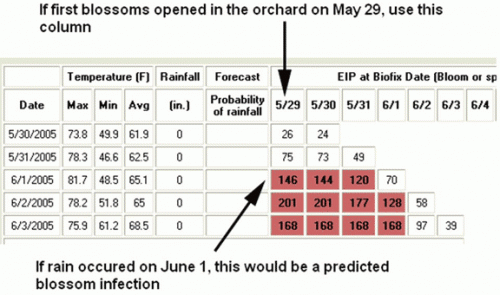The fire blight blossom model is based on the EIP value (Epiphytic Infection Potential), which is a way to express this heat unit accumulation on a 0 to 100 scale. ("Epiphytic" = plant surface). The EIP is calculated by dividing the current DH65 accumulation by 195 and then multiplying this by 100. If the DH65 reaches 195 (which also means that the EIP is 100), the bacteria have built up to a dangerous level, and a rain or heavy dew at this time will wash the bacterial down into the infection site and cause infection.