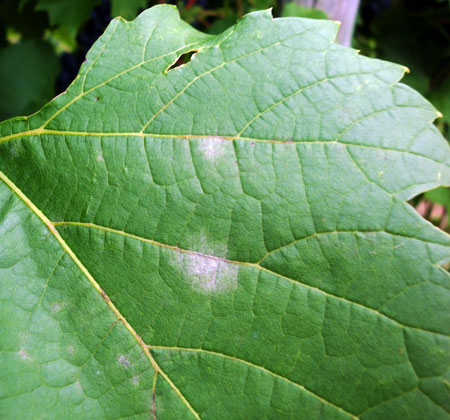 powdery mildew infection on grape leaves. Photo credit: Annemiek Schilder, MSU