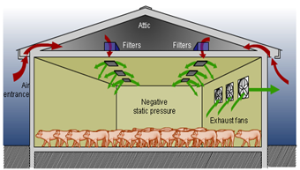 The recommended air inlet speed in a swine barn should be 600-900 ft./min. If the air entering the room from the ceiling inlets is moving too slow, then the air will not circulate properly and will fall directly down on the pigs creating excessive drafts and disrupt the manure patterns of pigs within the pens, which could increase the spread of disease. However, if the air enters the room too fast, this will result in erratic air circulation and temperature can ultimately inconsistent drafts throughout the barn.