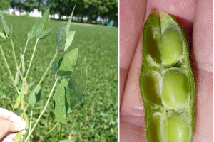 Corn and soybean fields have responded quickly to the recent rain. Standing water in low-lying areas will impede growth and possibly cause plant death if soils remain waterlogged for longer than two to three days. Early planted corn is at shoulder height, but there is a wide range of crop stages in the region. Soybean has reached full flower (R2, open flower at one of the two uppermost nodes) in most fields visited with up to nine trifoliates present, although most fields still have only five or six. Pods are forming at the base of plants in early-planted and short-season varieties. When pods of 3/16 inch or longer appear at one of the four uppermost nodes, the crop will have reached the beginning pod (R3) growth stage.