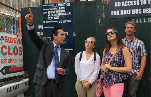 Photo of students at a train station terminal.Their second day began with morning presentations and a tour of the Salesforce/Transbay Terminal multimodal transit station.