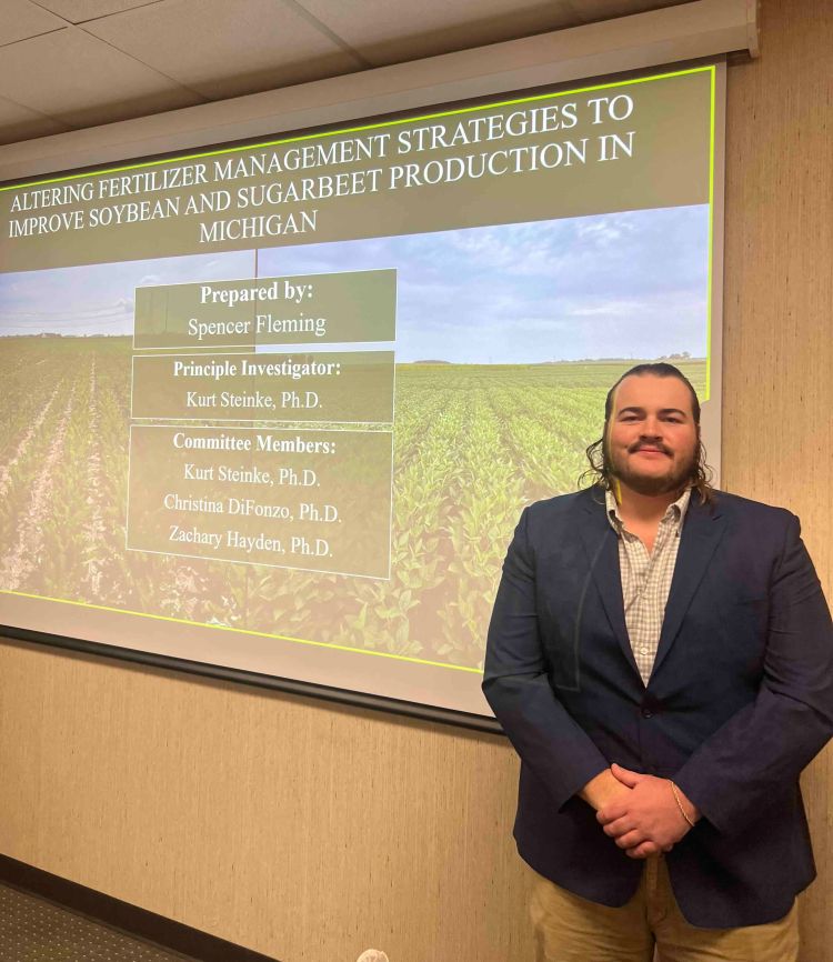 Spencer Fleming recently defended his CSS master’s thesis, “Altering Fertilizer Management Strategies to Improve Soybean and Sugar Beet Production in Michigan,” under the guidance of Dr. Kurt Steinke, Dr. Christina DiFonzo, and Dr. Zachary Hayden.