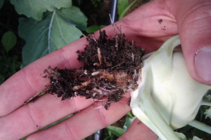 In addition to these leaf symptoms, heading cole crops can grow “blind” if feeding occurs before button stage, leaving only a brown scar in place of the head or stalk, sometimes creating a multi-stemmed plant. The rapidly expanding new tissue in broccoli and cauliflower florets is another egg-laying target, and can lead to misshapen, partially-filled heads, with brown scarring throughout.
