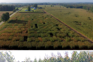 A commercial soybean field in Michigan’s Alpena County (45.019700, -83.758012) was selected for the trial based on landscape factors known to increase the likelihood of deer damage (forested field edges), and a history of significant deer damage as reported by the cooperating grower. The field was 142 acres in size, bordered on three sides by forestland and adjacent to large tracts of woodland maintained for wildlife and hunting. At this site, MG 1.7 soybeans were drilled in 7.5-inch rows at 250,000 seeds per acre on May 24, 2018. Plots 60-feet wide by 300-feet long were established running perpendicular to the west field edge shortly after planting (Figure 1). Two 4-feet by 4-feet by 5-feet tall exclusion cages constructed of steel fence posts and Tenax C flex plastic mesh fencing were placed in each plot, one being 100 feet from the field edge and another 250 feet from the field edge, to measure soybean development and yield potential with zero deer pressure (Figure 2).