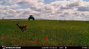 DeerPro Spring & Summer was applied at the same rate as site one using the grower’s self-propelled sprayer on June 22 at the first trifoliate (V1) stage, and again on July 18 at the four trifoliate (V4) stage. Both repellent applications were made immediately following, but separate from, glyphosate applications for weed control. Two 4-foot by 4-foot exclusion cages constructed of steel fence posts and Tenax C flex plastic mesh fencing were placed in each plot at approximately 30 feet and 150 feet from the field edge to measure soybean development and yield potential with zero deer pressure.