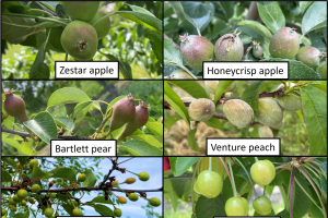 For early apple varieties, most advanced fruitlets range from 50 – 55 millimeters (mm) for Zestar, and Honeycrisp fruitlets ranged from 44 – 47 mm. Jonagold were 42 – 46 mm, and Minnieska fruitlets were 48 – 52 mm in Hart.
