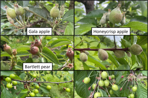 Fruitlets are growing steadily (Photo 1), and crop load looks good across fruit crops in the region. Based on the Hart Enviroweather station for June 24, current growing degree-day accumulation is 1,477 GDD42 and 847 GDD50.