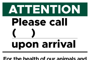 Printable biosecurity sign to alert visitors to call owners when they arrive, encouraging visitors to wear clean clothing and shoes, and to clean their hands. -