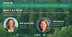 In this webinar, Edie Sonne Hall from Three Trees Consulting and Jane Alonso on behalf of US Endowment for Forestry and Communities present "Forestry Analytics for Carbon Tracking: The first-ever comprehensive forest carbon data system."