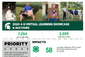 In 2020, Michigan State University Extension partnered with the Michigan State Fair to create the Michigan State Fair 4-H & Youth Virtual Showcase. This first-of-its-kind showcase provided a virtual platform for youth across Michigan to exhibit their work in a variety of project areas from the safety of their homes. Michigan youth ages 5-19 were encouraged to participate; 4-H membership was not required.
