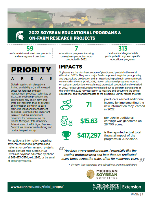 Global supply chain disruptions limited availability of, and increased prices for, fertilizer and pest management products (Schnitkey et al., 2022). Soybean producers and agronomists rely on on-farm and small plot research trials as sources of information on which to base their crop input and management decisions. To provide this important research and the educational programs for disseminating the results, Michigan State University Extension and the Michigan Soybean Committee have formed a strong and productive partnership.