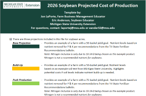 Farm profitability is a bottom-line priority for farmers and is a challenge in any year, but particularly in times when input costs are on the rise and grain prices are flat or falling. When margins are tight, farmers need to know their cost of production to determine what inputs and practices are profitable and which ones may need to be put on hold. The new MSU Extension 2026 Projected Cost of Production for Soybeans tool is intended to serve as a starting point for discussions on both expected income and expenses for individual farms.