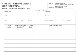 4-H Spring Achievements is an opportunity for 4-H members to showcase their 4-H projects each spring before fair season gets underway. 4-H members projects are entered, judged & displayed during the event. The schedule of events outlines the activities that take place during 4-H Spring Achievements.