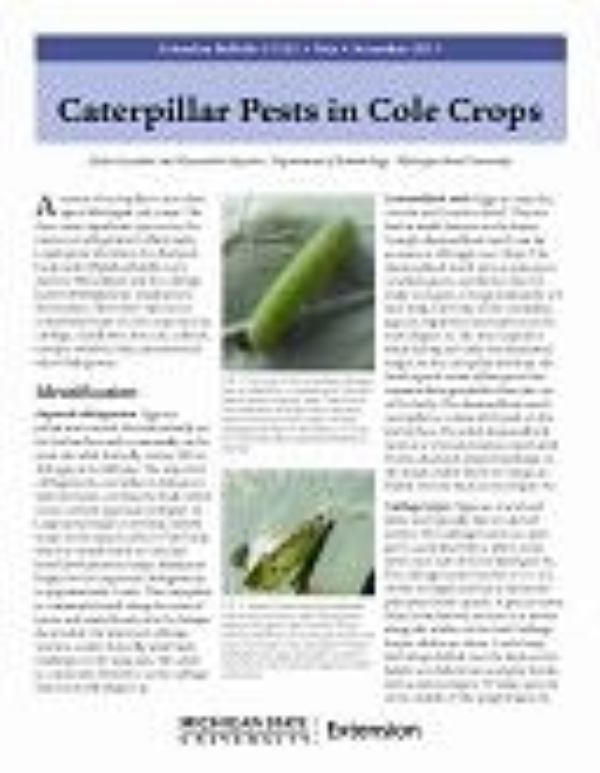 A variety of caterpillars cause damage in Michigan cole crops. The three most significant species are the imported cabbageworm (Pieris rapae, Lepidoptera: Pieridae), the diamondback moth (Plutella xylostella, Lepidoptera: Plutellidae) and the cabbage looper (Trichoplusia ni, Lepidoptera: Noctuidae). These three species are commonly found on cole crops such as cabbage, cauliflower, broccoli, collards, turnips, radishes, kale, mustards and other leafy greens.
