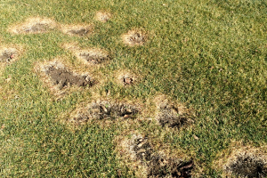 The presence of irregularly-shaped yellow patches that turn brown and die is characteristic of chinch bug injury. Clumps of clover and other non-grass weeds may survive in these areas. Plant damage results not only from withdrawal of sap, but from chinch bug saliva, which contain substances toxic to the plant.