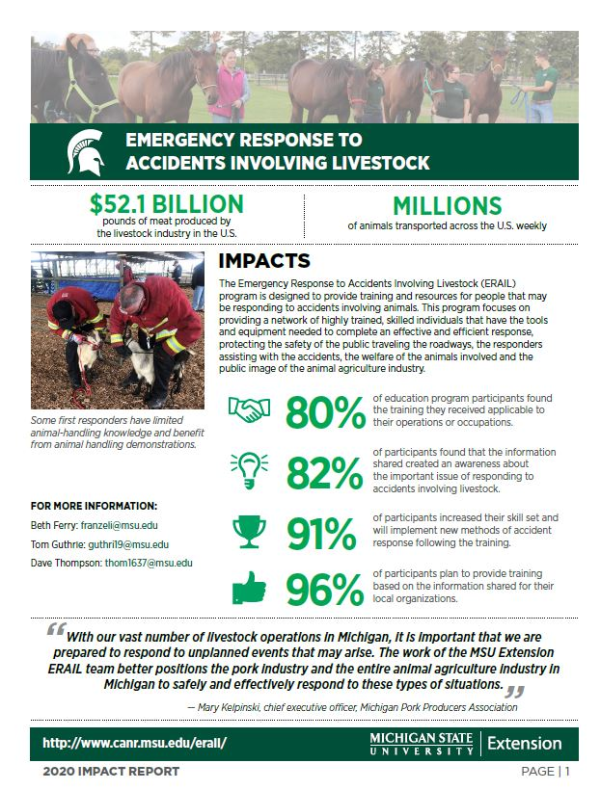 By creating and providing these resources, the ERAIL team has developed a network of trained individuals throughout Michigan that can respond to these events. This network includes first responders (paid and on-call), law enforcement officers, animal control departments, farmers, transportation companies, truck drivers, veterinarians, processing companies and allied agriculture industry members. As interest in this area grows, the ERAIL team will continue to enhance the understanding of the need for fully equipped response trailers across the state, designed to aid first responders in managing accidents involving livestock. By combining these resources, providing training, developing informational materials and building this network, Michigan first responders and their partner stakeholders will be poised to respond to accidents involving livestock effectively, thereby securing animal welfare, reducing risks to public safety and avoiding the negative economic impact these events can have on food production.