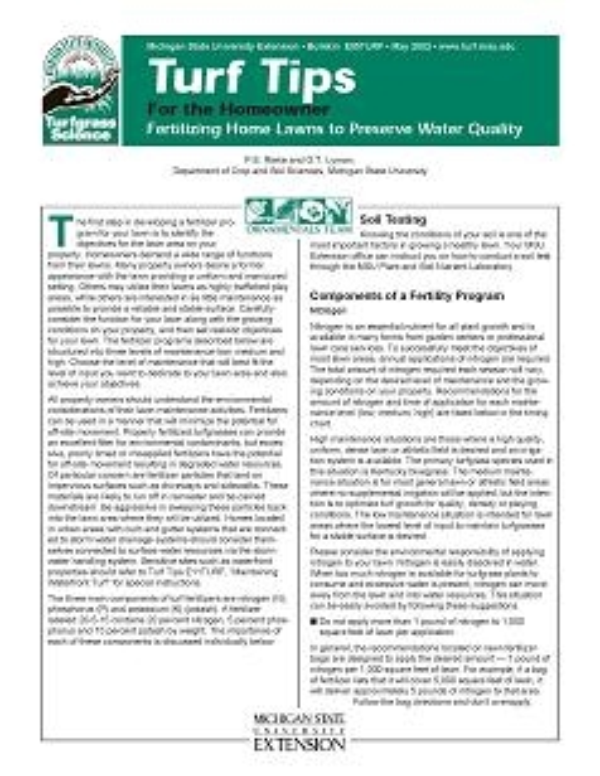 All property owners should understand the environmental considerations of their lawn maintenance activities. Fertilizers can be used in a manner that will minimize the potential for off-site movement. Properly fertilized turfgrasses can provide an excellent filter for environmental contaminants, but excessive, poorly timed or misapplied fertilizers have the potential for off-site movement resulting in degraded water resources. Of particular concern are fertilizer particles that land on impervious surfaces such as driveways and sidewalks. These materials are likely to run off in rainwater and be carried downstream. Be aggressive in sweeping these particles back into the lawn area where they will be utilized. Homes located in urban areas with curb and gutter systems that are connected to storm water drainage systems should consider themselves connected to surface water resources via the storm water handling system. Sensitive sites such as waterfront properties should refer to Turf Tips E11TURF, “Maintaining Waterfront Turf” for special instructions.