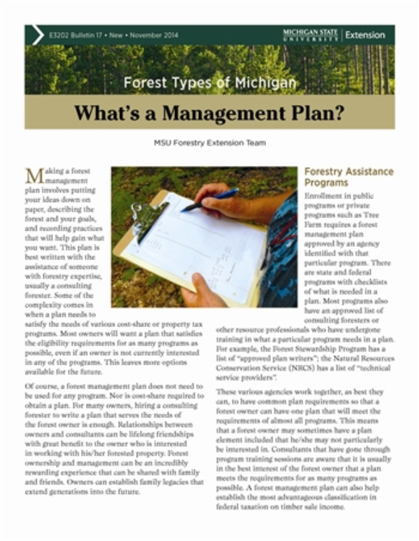 Making a forest management plan involves putting your ideas down on paper, describing the forest and your goals, and recording practices that will help gain what you want. This plan is best written with the assistance of someone with forestry expertise, usually a consulting forester. Some of the complexity comes in when a plan needs to satisfy the needs of various cost-share or property tax programs. Most owners will want a plan that satisfies the eligibility requirements for as many programs as possible, even if an owner is not currently interested in any of the programs. This leaves more options available for the future.
