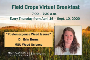 The MSU Extension Field Crops Virtual Breakfast weekly discussion for August 20, 2020, focuses on grain marketing, presented by Dr. Aleks Schaefer, MSU Agricultural and Food Policy. Following Dr. Schaefers’ presentation, MSU specialists give updates and answer questions on insect pests and diseases and current conditions.