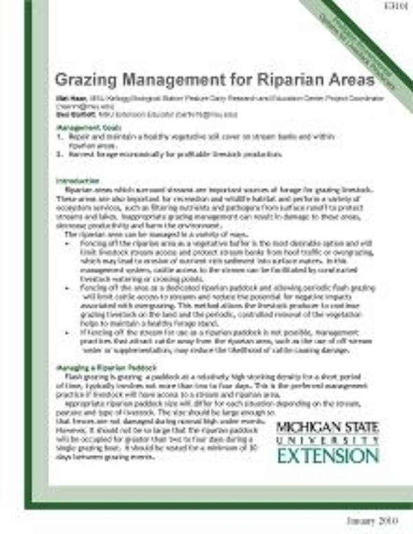 Riparian areas which surround streams are important sources of forage for grazing livestock. These areas are also important for recreation and wildlife habitat and perform a variety of ecosystem services, such as filtering nutrients and pathogens from surface runoff to protect streams and lakes. Inappropriate grazing management can result in damage to these areas, decrease productivity and harm the environment. The riparian area can be managed in a variety of ways. • Fencing off the riparian area as a vegetative buffer is the most desirable option and will limit livestock stream access and protect stream banks from hoof traffic or overgrazing, which may lead to erosion of nutrient-rich sediment into surface waters. In this management system, cattle access to the stream can be facilitated by constructed livestock watering or crossing points.