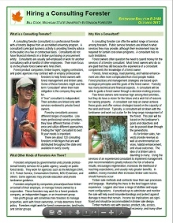 Nearly all of Michigan is covered by at least one or two forestry consultants. The Michigan State University Department of Forestry and MSU Extension provide an on-line directory of consultants. Searches are done by counties and each consultant listing includes a list of services offered. The URL is [http://www.for.msu.edu] under the Extension & Outreach tab. The directory is self-selective and listings are not screened.
