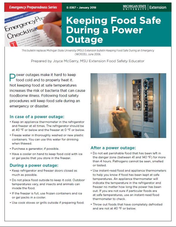 This bulletin replaces Michigan State University (MSU) Extension bulletin Keeping Food Safe During an Emergency (WO1035), June 2006. Prepared by Joyce McGarry, MSU Extension Food Safety Educator