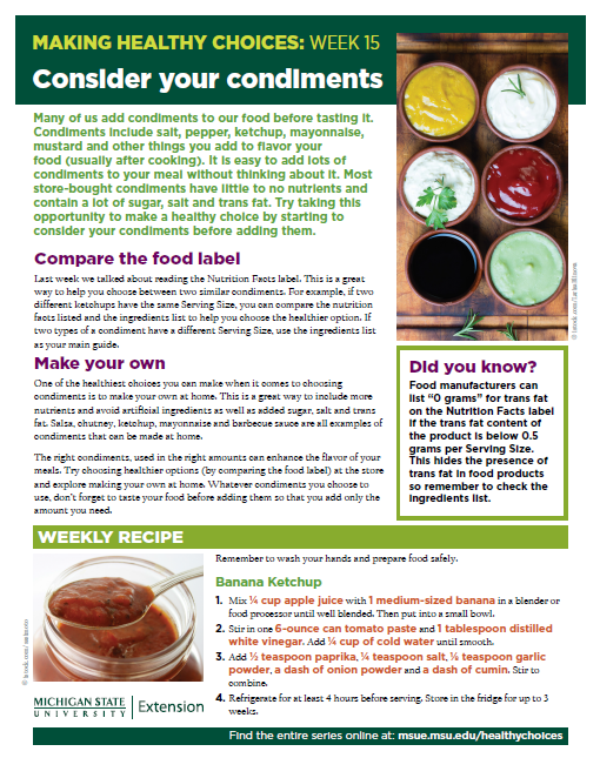 Many of us add condiments to our food before tasting it. Condiments include salt, pepper, ketchup, mayonnaise, mustard and other things you add to flavor your food (usually after cooking). It is easy to add lots of condiments to your meal without thinking about it. Most store-bought condiments have little to no nutrients and contain a lot of sugar, salt and trans fat. Try taking this opportunity to make a healthy choice by starting to consider your condiments before adding them.