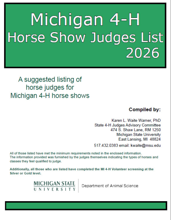 The Michigan 4-H Horse Show Judges List is a resource for individuals in charge of securing judges for Michigan 4-H horse shows. This suggested listing is compiled by the State 4-H Judges Advisory Committee and includes individuals who meet the minimum requirements set forth by the committee (guidelines provided in the document). The information about the judges is provided by the individuals themselves.