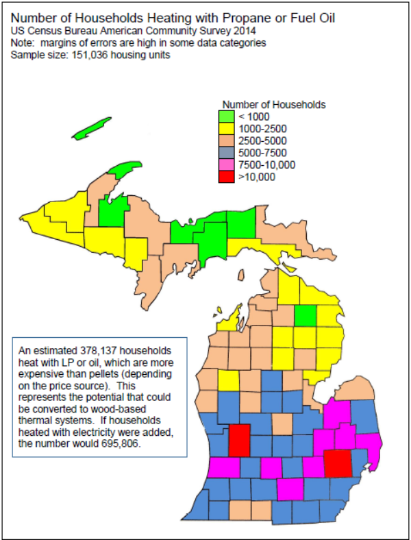 An estimated 378,137 households heat with LP or oil, which are more expensive than pellets (depending on the price source). This represents the potential that could be converted to wood-based thermal systems. If households heated with electricity were added, the number would 695,806.