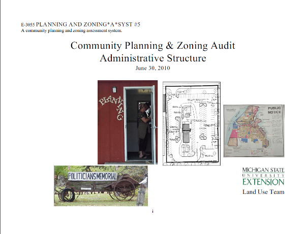 Planning and Zoning*A*Syst. #5: Community Planning & Zoning Audit, Administrative Structure (E3055), provides a performance audit for the operation of the planning commission, zoning administrator and zoning board of appeals. It covers office procedures, job descriptions, filing systems, bylaws, rules of procedure, compliance with the Open Meetings Act, minutes and process for meetings and decision making. By Brad Neumann, Senior Extension Educator; Kurt H. Schindler, Senior Extension Educator; and Jasneet Sharma, Extension Educator.