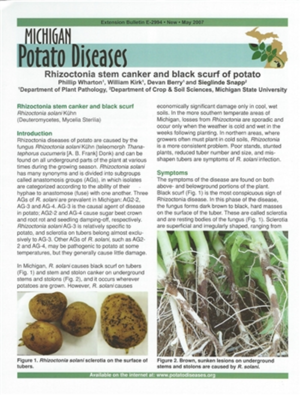 Currently, it is not possible to completely control Rhizoctonia diseases, but following a combination of cultural and crop protection strategies may limit their severity. Effective management of this disease requires implementation of an integrated disease management approach and knowledge of each stage of the disease. Although the most important measures are cultural, chemical controls should also be utilized. To date, there have been no comparisons of the relative susceptibility of potato varieties currently grown in Michigan.