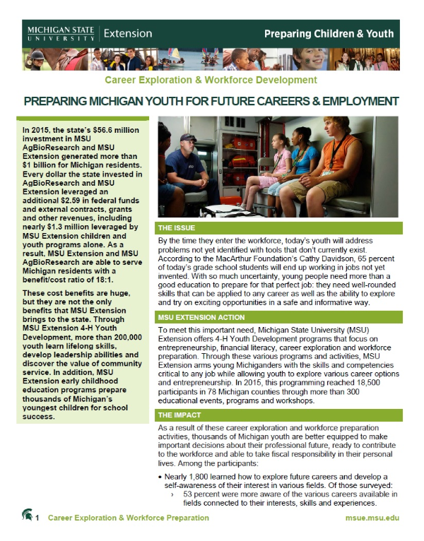 To meet this important need, Michigan State University (MSU) Extension offers 4-H Youth Development programs that focus on entrepreneurship, financial literacy, career exploration and workforce preparation. Through these various programs and activities, MSU Extension arms young Michiganders with the skills and competencies critical to any job while allowing youth to explore various career options and entrepreneurship. In 2015, this programming reached 18,500 participants in 78 Michigan counties through more than 300 educational events, programs and workshops.
