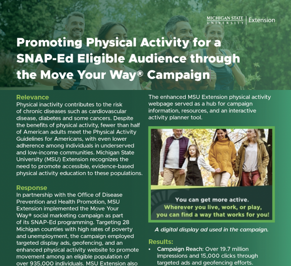 In partnership with the Office of Disease Prevention and Health Promotion, MSU Extension implemented the Move Your Way® social marketing campaign as part of its SNAP-Ed programming. Targeting 28 Michigan counties with high rates of poverty and unemployment, the campaign employed targeted display ads, geofencing, and an enhanced physical activity website to promote movement among an eligible population of over 935,000 individuals. MSU Extension also localized campaign creatives with Michigan-specific imagery, messages, and branding to better engage the community.