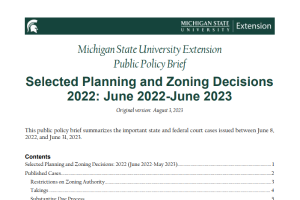A policy brief on selected zoning court cases concerning the Michigan Right to Farm Act and local zoning jurisdiction. For questions, please contact Mary Reilly. Please make sure your copy is not dated before July 21, 2022.