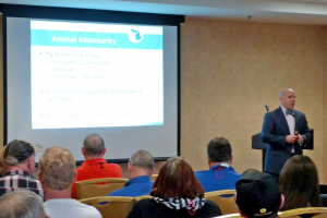Remember to use good biosecurity practices when caring for animals. This sign reminds people how to be healthy at the fair.