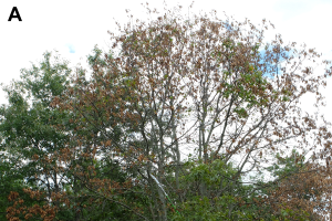 An infected tree is often first noticed when leaves suddenly drop or turn brown in the summer months. Leaves may be brown, somewhat bronzed or partially green. Red oak trees may be dead and defoliated within four weeks of infection.