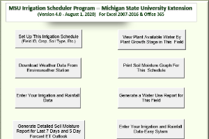 This resource provides a printable soil water balance sheet and crop-specific guidance for scheduling irrigation using evapotranspiration, rooting depth, rainfall, and crop stage to help optimize water use in corn and soybean production.