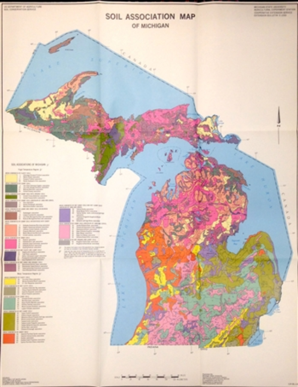 Michigan is covered with soils that vary widely in thickness, color, texture, chemical and mineralogical composition. It is impossible to show all of the many soil variations on a map of this scale.