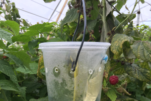 Monitoring: The first and most important step is to determine whether SWD are present. This can be done using a simple monitoring trap, consisting of a plastic 32 oz. cup with several 3/16” -3/8” holes around the sides of the cup, leaving a 3” to 4” section without holes to facilitate pouring out liquid. The holes can be drilled in sturdy containers or burned with a hot wire or wood burner in the thinner plastic cups. Pour 1” to 2” of pure apple cider vinegar into the trap as bait. To help attract flies and ensure that trapped flies do not escape, a small yellow sticky trap is placed inside the trap. Traps are hung in the shade in the fruit zone using a stake or a wire attached to the sides of the trap, and fastened to a branch or trellis wire. Check traps at least weekly for SWD flies, and change the vinegar. Pour the old vinegar into a bottle or away from the trap location, and place traps back near the crop with fresh vinegar. Continue monitoring through harvest and post-harvest.