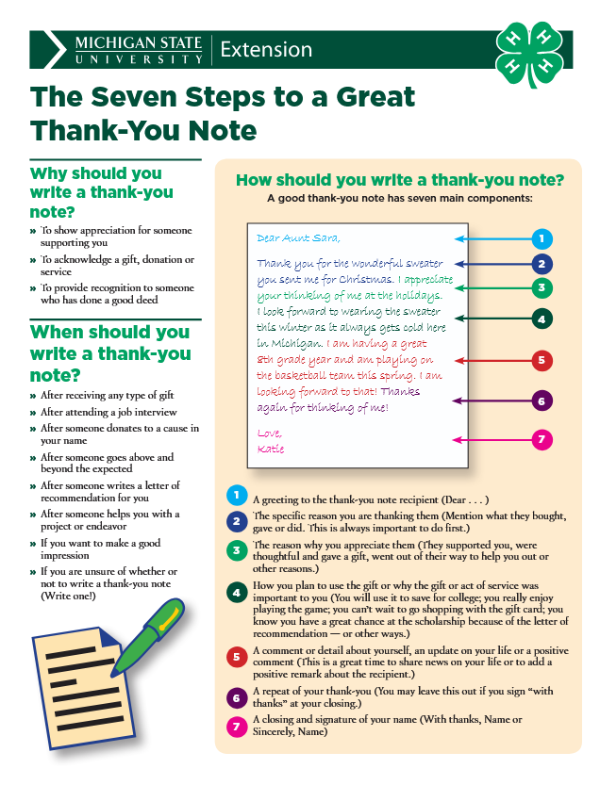 Aspects of the steps taken from “6 Steps to Writing a Thank You Note – Holiday Edition,” Dec. 16, 2010, Dale Carnegie Training. New York. Retrieved from http://blog.dalecarnegie.com/teammemberengagement/6-steps-to-writing-a-thank-you-note-holiday-edition/
